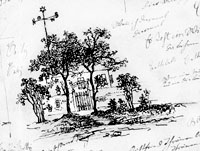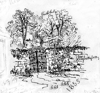 Ein Haus, hinter Bäumen und Bäumchen, von einer Mauer umgeben und halb verborgen. Auf einer Stange weithin sichtbar ist darüber ein sechszackiger (ungeschweifter) Leit-Stern befestigt. Das an gleicher Stange darunter angebrachte, etwas windschiefe Kompaß-Kreuz bietet Orientierung in alle Richtungen (ein verlorener Kompaß war einmal Anlaß einer Verstimmung zwischen Keller und Betty Tendering geworden: vgl. Kellers Brief an Lina Duncker vom 6.3.1856). Die Bildregie führt den Blick zum Eingang des Anwesens "Betti". Die Tür ist verschlossen und ohne Klinke; das Fenster in der Mauer daneben ist vergittert. Ob hinter dem Haus der Zugang offen wäre (wie bei Dortchen Schönfund oder bei Lucie im Sinngedicht), ist nicht zu sehen. Man steht draußen.