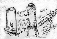 Im Frauenzimmer, vielleicht an der von den Vögeln aus sichtbaren anderen Wand, Bettys Spiegel, im Rahmen ein Billet von "G. K." Hinter Wand und Spiegel steht ein zweiter, prächtigerer, gekrönter Wandspiegel Bettys, im Rahmen viele weitere Briefchen. Wie der junge grüne Heinrich hinter dem gemalten Zauberspiegel der Faust-Kulissen die "Wirrnis des jenseitigen Lebens", wie hinter den Vexierspiegeln von Züs Bünzlins Veits-Tempel die versteckte Liebeserklärung, so entdeckt man hier hinter dieser zweiten Wand zwischen "Rinnsal" und "Trübsal", Ort (Betty Tendering stammte aus dem Rheinland) und Zahlenreihe einen Schwarm zahlloser "Bettys" (die letzte in Spiegelschrift) - Zeichen verrückter Schwärmerei. Anders als im Faust-Spiel Heinrichs bleibt die "sehr schöne Frau" aber bloße Schrift; wie bei Veits Liebesgeständnis bleibt die Adressatin unerreichbar. Zwischen Wand und Spiegel die verbale Spiegelung der Protagonisten im Wortspiel: "Spiegelinski, Spiegelanski, Spiegelwerk, Vorspiegelung, Spiegelberger, Guckinspiegel". Die Spiegel sind leer.