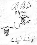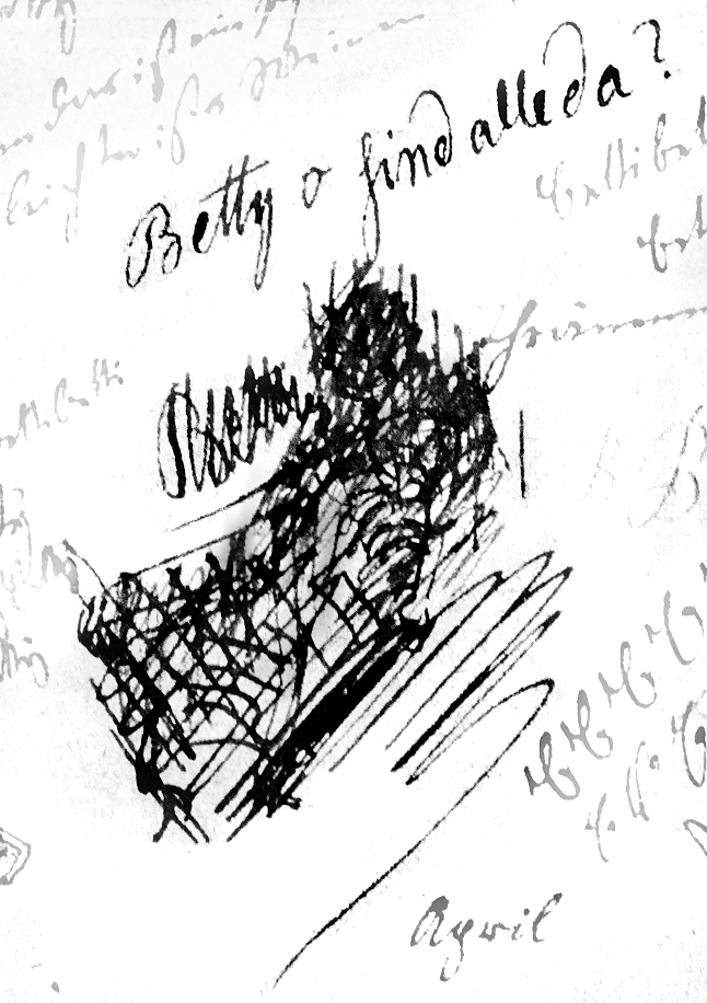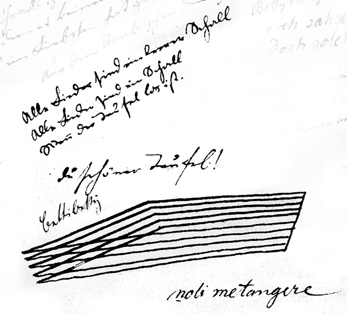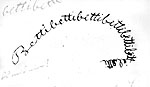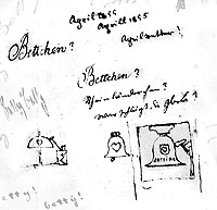 BETTY BETTY, Bettybettybettybettybetty..., Bettibettibettibettibetti..., tibetti tibetti, Bbettyttybetti, Bethly, Bethely, Bettly Bettly..., Bettchen? Bettchen?..., Betty bitte! bitte Betty!..., BBBBBBBBBBetty..., bittre bittre schöne süße Zeit, bittere Kräuter, Bitterlichkeiten..., [in Spiegelschrift: liebe Betty! Betty liebste schönste beste!...,] B B B etc. pp. ad infinitum -
