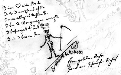 Der Tod stellt sich auch als kleines, unbehütete Sensenmännchen mit spärlich-wirrem Haar in Positur und setzt einem erbaulichen Bilderrätselgedicht im Volksliedton ein Ende:
