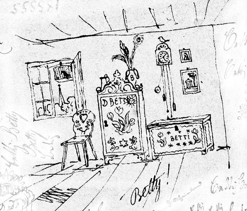 Im Haus: ein Frauenzimmer (ohne Tisch oder Bett) im Bauernbarock; die schmucken Möbel sind allesamt mit "Betti" bezeichnet und allegorisiert. Schränkchen und Kommode haben große schwarze Schlüssel-Löcher; ein Schlüssel fehlt. Auf dem Schrank ein Krug und eine Vase mit Blume und hochragender Pfauenfeder; über der Kommode zwei Bilder an der Wand und eine Uhr, auf der ein kleiner weißer Vogel sitzt. Das heftig schlagende Pendel (die einzige Bewegung im Bild) zeigt das Vergehen der Zeit an. Durch das offene Fenster - der Fensterflügel ist nach innen geöffnet! - sieht man nach draußen auf einen Kirchturm hinter Bäumen; im Fensterrahmen hängt, abgewendet von dem weißen, ein schwarzer Vogel im engen Käfig (die Schrumpfform der geplagten traurigen Kreatur, die Pankraz' Heimkehr ankündigt? das von Züs Bünzlin nur sehr ungern weggestorbene Haustier?). Er wurde hier aufgehängt, zwischen drinnen und draußen, von der Freiheit wie von Betty durch Gitterstäbe getrennt. Sie ist abwesend.