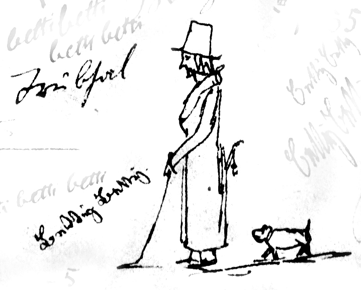 Wieder draußen auf der Straße: ein schlanker, etwas steifer, langhaariger Mann im Gehrock (auch Keller hielt sich in Berlin meist - nicht immer - "still und steif in seinen schwarzen Fräcklein", wie er Freiligrath im Oktober 1855 mitteilte), mit Zylinder und Pfeife, Spazierstock (oder Blindenstock?), halb Bohemien, halb Biedermann - der einzige Mensch in der ganzen Geschichte. Es ist unklar, ob er geht oder steht, ob er "Betty" oder "Trübsal" vor sich hat. Daß ihm sein Mops folgt - Inbegriff und Karikatur der Treue ("der Hund begleitet seinen Herrn durch alle Gefahren und stürzt sich für ihn in das Meer", weiß Züs Bünzlin mitzuteilen) -, macht nur sichtbarer, daß er allein ist.