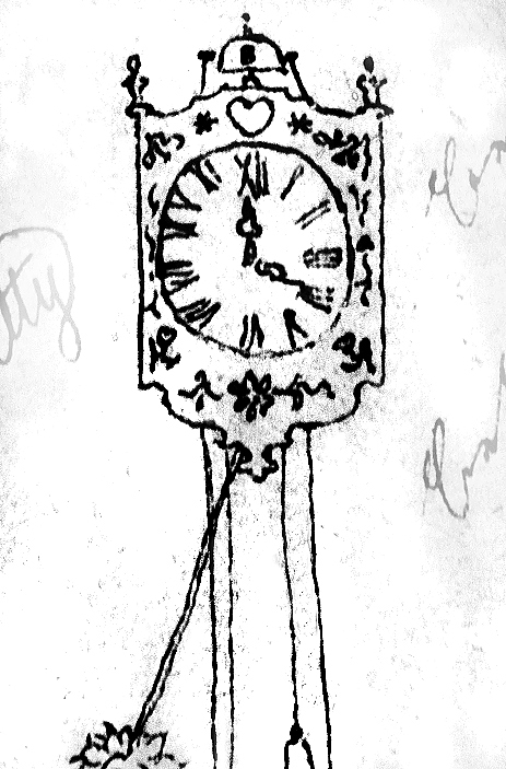 Zurück im Zimmer: groß im Bild ist jetzt eine zweite Pendeluhr, größer und schöner als die erste; ein Herz kennzeichnet sie als Uhr des Gefühls. Das wiederum heftig ausschlagende Pendel hat die Form einer Sonnenblume mit fragenden (erstaunten, traurigen?) Gesicht. Die Gewichte hängen unten über den Rand des Blattes hinaus. Auf der Uhr über dem gemalten Herzen, dort, wo auf der anderen Uhr das weiße Vögelchen saß, ist eine Alarmglocke mit zwei Hämmerchen angebracht. Auf der Glocke ist ein "B" eingraviert.