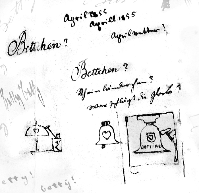 Noch näher herangehend, rückt die Glocke ins Zentrum, in dreifacher Ausführung mit Hämmerchen, (bereits schwingendem) Klöppel und Hammer, als Wecker und als Kirchturmglocke. Die sich stellende Frage ist: wann geht der Alarm los, der den 'gefrorenen Christen' weckt (das Silesius-Distichon des grünen Heinrich findet sich - mit der Abweichung "Wach auf ..." statt "Blüh' auf ..." - an anderer Stelle auf dem Blatt), und was wird ihn auslösen? Die an Betty gestellten Fragen sind: "Bettchen? Bettchen? Rheinländerchen? Was schlägt die Glocke?" Das unberechenbare "Aprilwetter!" des "Aprill 1855" läßt alle Möglichkeiten offen ("Ich sah schon oft es blitzen / Doch solch' ein Wetter nie!" heißt es anderswo auf dem Blatt). Noch näher heran kommen wir nicht, weder ins Innere des Herzensuhrwerks noch an eine Antwort.